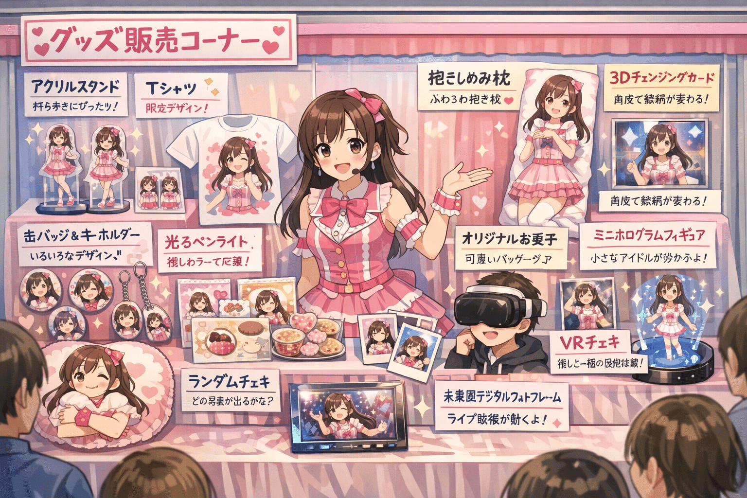アイドルが自分のグッズ販売イベントで様々なノベルティーグッズを販売している風景をイラストで描いて下さい。ただし、ノベルティーグッズは定番のも···