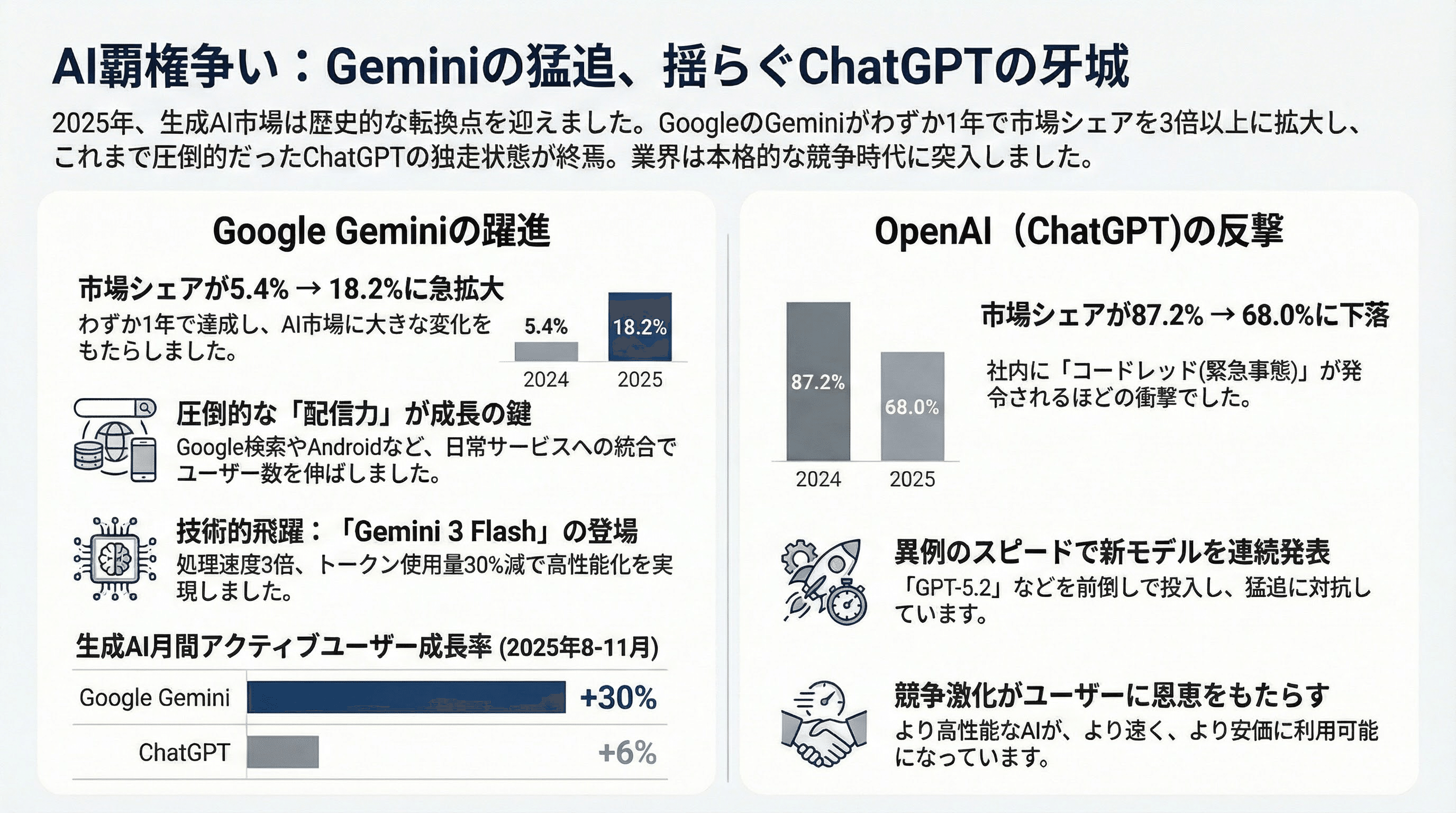 2025年、生成AI業界に歴史的な地殻変動が起きています。わずか1年前まで市場シェア5.4%だったGoogleのGeminiが、2025年末には18.2%まで急拡大しました···