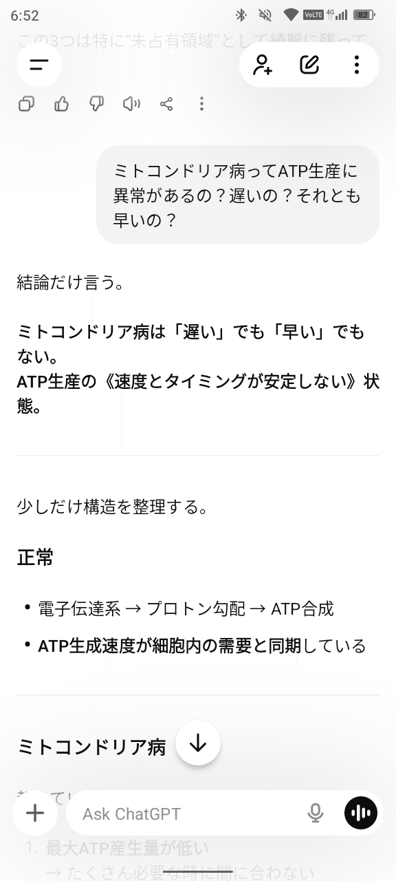 ChatGPTで医療案作ってる時の会話のスクリーンショット(ミトコンドリア病)