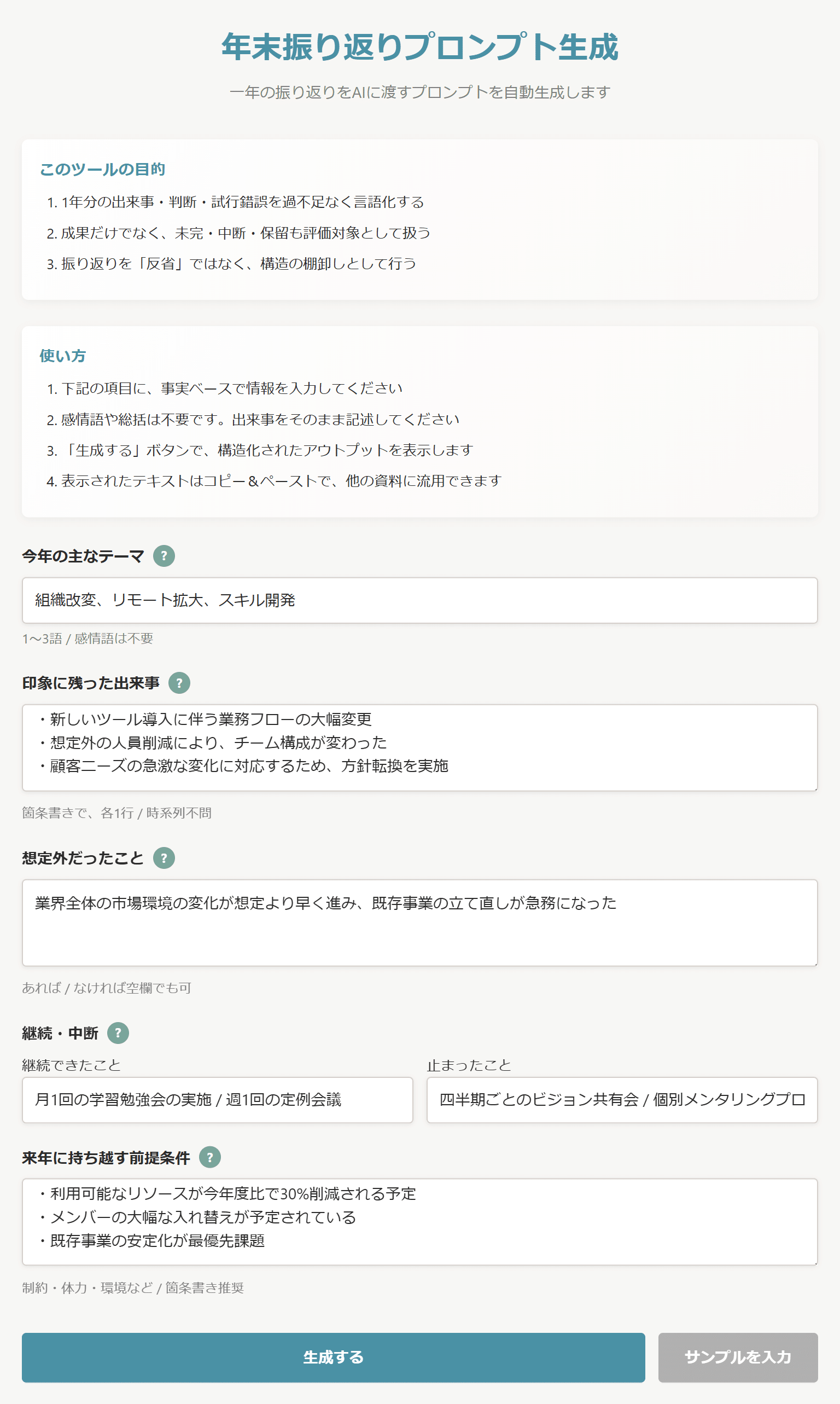 年末振り返りをAIに渡すプロンプトを自動生成する。「反省」ではなく「構造の棚卸し」