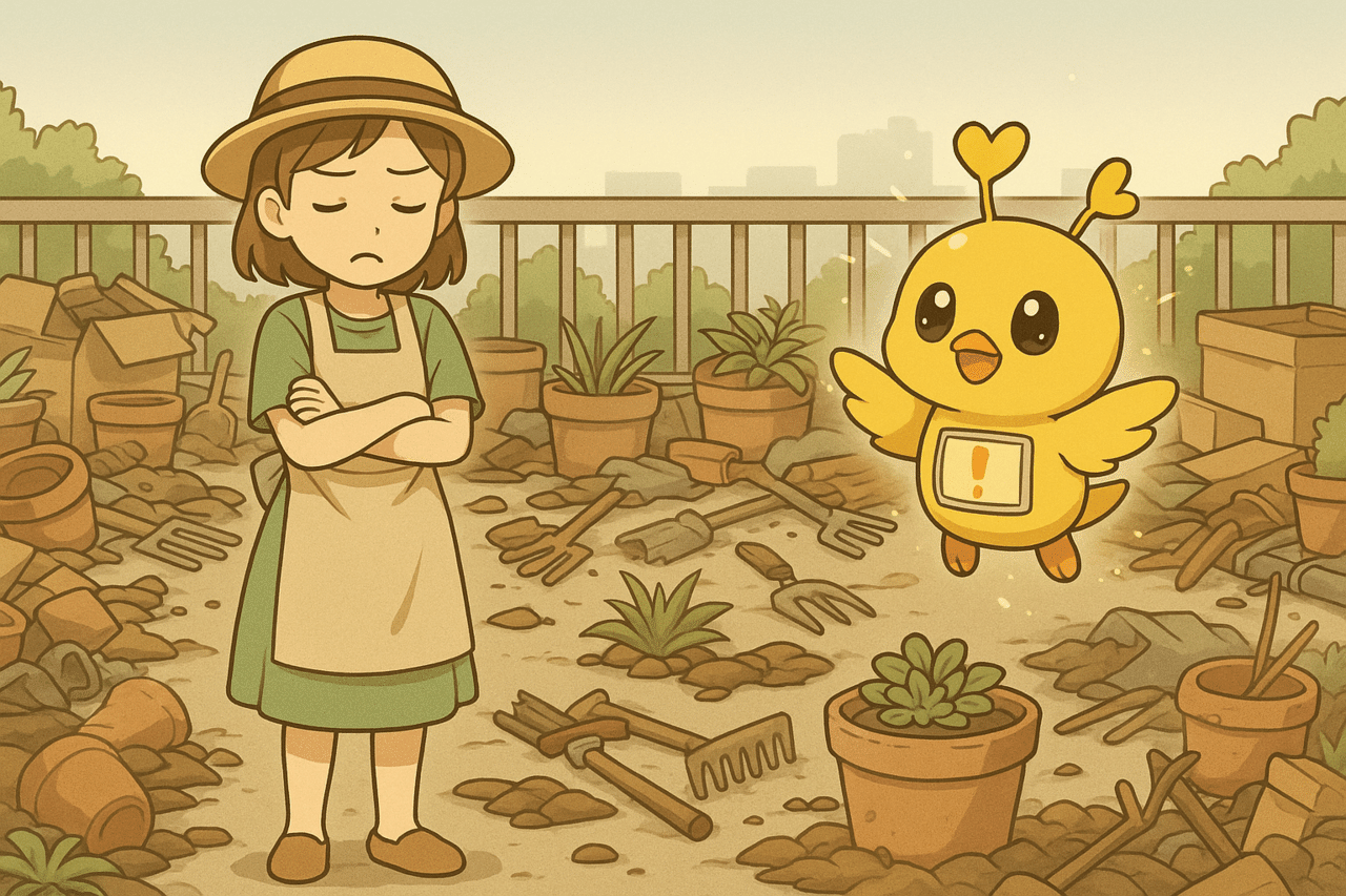 ベランダのあちこちで、鉢と道具が静かに積み重なってそのままになっています。園芸と植物は大好きなのに、忙しさで手が止まり、気づけば散らかりが積···