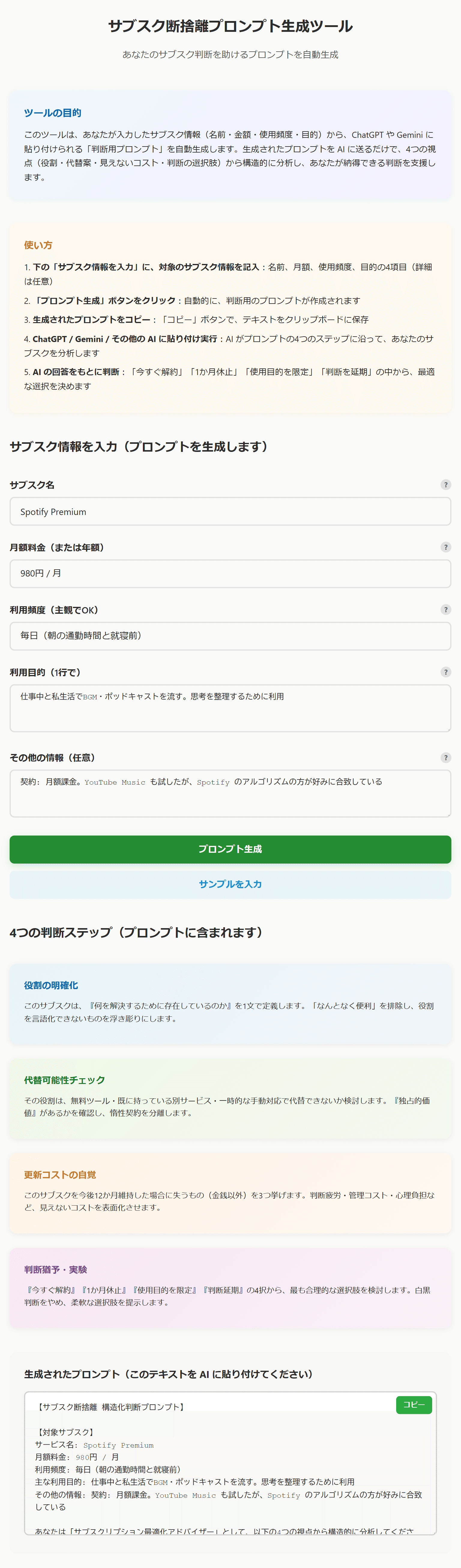 サブスク断捨離プロンプト生成ツール|AIと一緒に「本当に必要なサブスク」を判断する