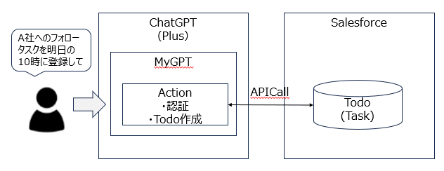 ChatGPT上で「A社へのフォロータスクを明日の10時に登録して」と指示すると、SalesforceのTodoとカレンダーが自動登録されるAIエージェント(MyGPT+···