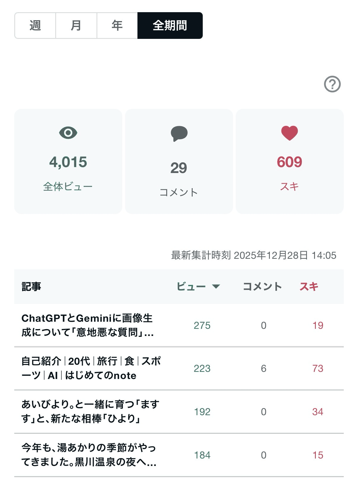 noteを始めて約3ヶ月。全期間のビューは、だいたい4,000くらいでした。続きをみる···
